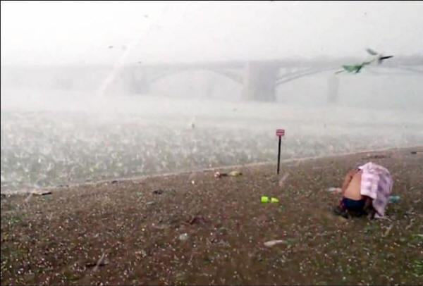 V posnetkih, ki jih je posnel, je jasno, kako so obiskovalci enega izmed mest plaže poskušajo pobegniti pred orkanom, ki je nenadoma padel nanje. V eni minuti se srednje močan veter spremeni v nevihto, ki piha različne predmete in naplavine, po katerih začnejo padati z neba velikanski nakloni.