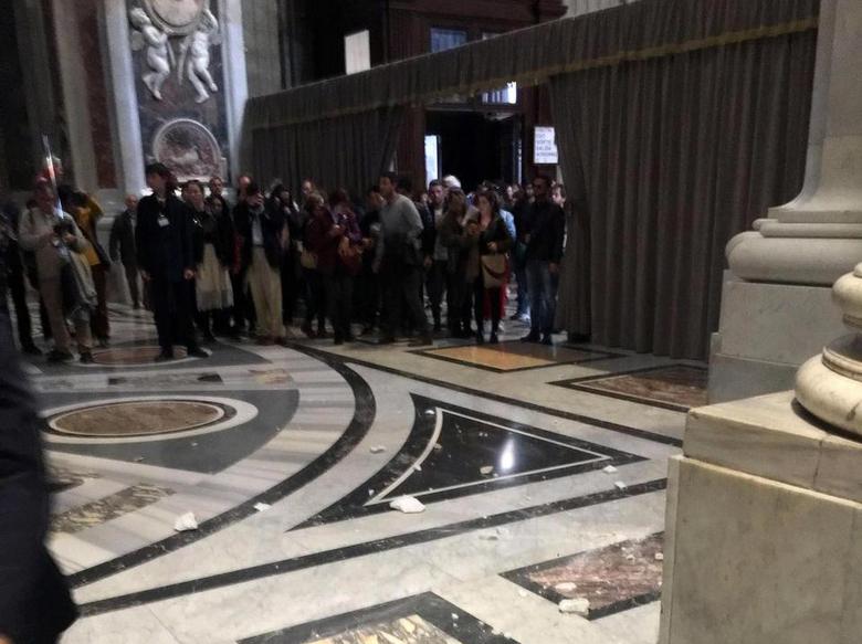 Po tako glasni izjavi papeža ni minil dan, ko je mavec nenadoma padel s kupole bazilike svetega Petra. In je sredi svetega tedna pred katoliško veliko nočjo – prav glave mnogih romarjev, katerih priliv v to Veliko noč dni je Vatikan pričakoval do 5 milijonov.
