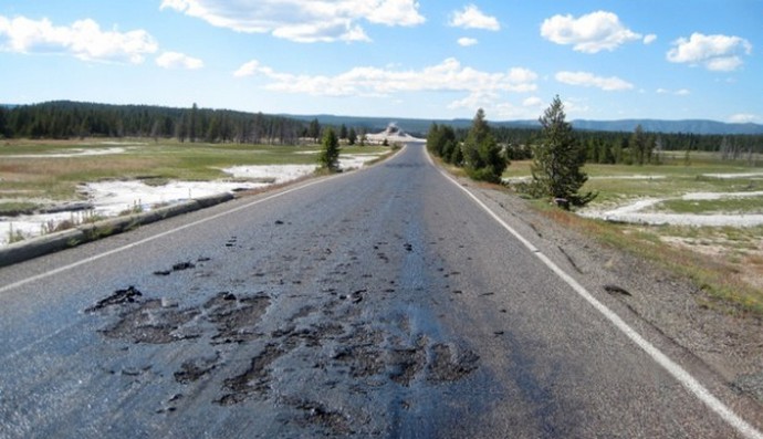 Se pravi, da se v črevesju zemlje pod parkom Yellowstone nahaja v sedanjost je nekaj strašljivega, na primer videz (fotografija spodaj), kaj se zgodi z njenimi cestami in zato oblasti resno skrbijo s tem.