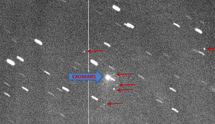Na slikah, ki jih je pripravila Evropska vesoljska agencija dne na njihovem spletnem mestu, kjer se tudi točijo fotografije iz Avstralije, Brazilija, Nova Zelandija, opazili boste, da postaja ExoMars, ki je na fotografiji videti kot precej velik svetel predmet, v vesolju spremljajo šest manjših vozil, sinhrono premikanje z zemeljsko raketo (na spodnji sliki so označene rdeče puščice).