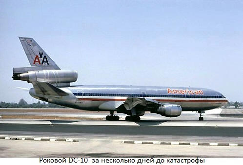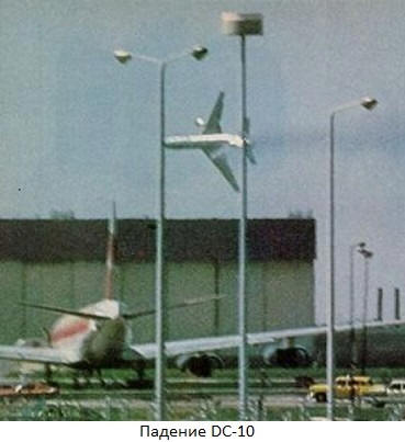 25. maja 1979 Ode DC-10 (Douglas), ki leti iz New Yorka v Chicago – Los Angeles American Airlines, ki je obdavčen pri vzletu letališče čikaga. Na krovu je bilo 258 potnikov in 13 članov posadke. Bilo je jasno, toplo vreme, vidljivost, všeč piloti so dejali: “milijon v milijonu.” Ob 15:02 170-tonski zračni avtobus pobotati, pridobivati hitrost. Letalo je pospešilo do hitrosti 245km / h (hitrost vzpenjanja), ko se je levi motor ugasnil in padel na pisti za letalom. Kričali so vsi, ki so to videli groza. DC-10 je vzletel na preostalih 2 motorjih in začel pridobivati hitrost in nadmorska višina. Če bi letalo nadaljevalo letenje brez zmanjšanja hitrosti, tragediji, morda bi se lahko izognili, vendar navodilo predpisana v primeru, da eden od motorjev ne zmanjša hitrosti do 245km / h. Posadka je odkrila pomanjkanje oprijema levega motorja, toda ne vedo razloge za to, kar se je zgodilo (ne okvara, ampak izguba motorja!), je začel upočasni in Douglas je bil obsojen. S hitrostjo 255km / h letalo je začelo padati, in ko je zvitek dosegel 90 stopinj, da pade. Odkar je letalo priletelo, je minilo manj kot minute zemljišča, ko je strmoglavil v tla na 1.420 metrih od vzletno-pristajalne steze. Razneslo rezervoarji za gorivo polni goriva. Dim je bil viden noter v centru Chicaga. Sirene so hitele na mesto nesreče gasilske in reševalne brigade letaliških služb. Ampak če gasilci so pričakovali trdo delo za gašenje požara, nato pa zdravniki oz. vse so videli na lastne oči, razumeli, da njihova pomoč ni verjetna potrebujejo.