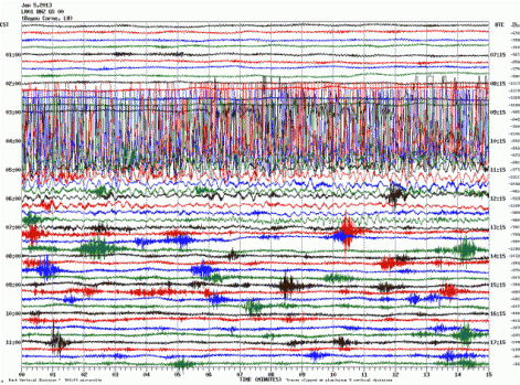 Ta graf prikazuje reakcijo Yellowstonea na potres. 7,5 na Aljaski