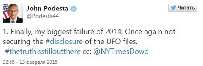 John Podesta je že dolgo znan po zanimanju za NLP-je in stike z njimi nezemeljske civilizacije. Zdaj je razočaran, ko to pove da Bela hiša ne bo in ne bo razkrila Američani skrivnost o tujcih z drugih planetov. Leta 2002 Podesta je trdil, da si ameriški državljani zaslužijo to vedeti resnica. Bil je trdno prepričan, da lahko sprejmejo to resnico, in sodeč po tvitu, ki ga je objavil bivši svetovalec predsednika Podesta meni tako in še vedno.