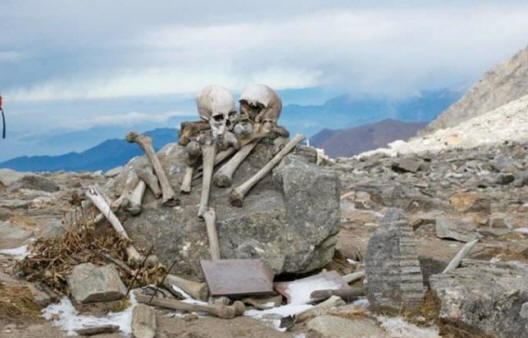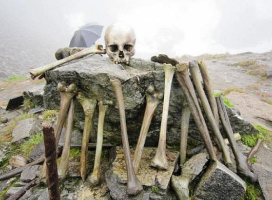 Roopkund – ledeniško jezero, ki se nahaja na nadmorski višini na približno 5.029 metrih v Uttarakhandu v Indiji. Ko se led stopi na stotine človeških okostij se pojavi na površju ali plavajo noter vode. Jezero je leta 1942 prvič odkril nevalec lovski rezervat, čeprav so se omenjene kosti pojavile s konec 19. stoletja. Prvotno so bili verjeti ostanki Japonski vojaki, ki so se podali na območje in nato umrli v bober s strašnim vremenom.