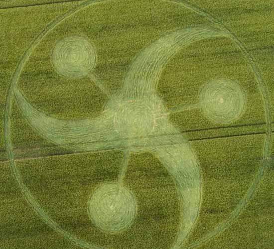 Domnevno sporočilo tujcev odlično kaže enakomeren obroč, v katerega so vpisani štirje manjši krogi, povezane s tremi črtami. Tudi ta slika je prekrivna. v obliki nekakšnega vijaka s tremi rezili. Doslej ufologi in drugi raziskovalci nadnaravnih pojavov ne znajo razložiti kaj to pomeni Žal, pomen skoraj vseh mojstrovin na poljih za človeštvo ostaja absolutna skrivnost.
