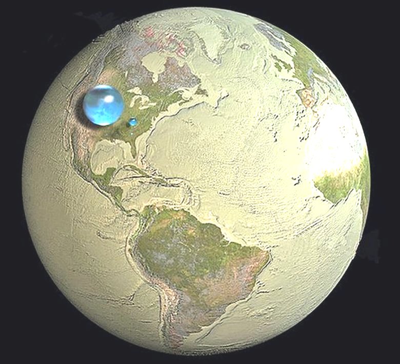 Nekoč je internet šel okoli “obnove” Zemlje brez vode – nekakšen neenakomeren vesoljski blok z gorskimi “stožci” in oceanske “luknje”, so iz nekega razloga postale virusna slika, torej kot laik – navsezadnje se izkaže, kako neenakomeren naš planet! Vendar bodite pozorni na količino zemeljske vode (foto spodaj, kjer je velika krogla vsa slana voda Zemlje, je majhna celota svež) v primerjavi z njegovo maso. Predstavljajte si tudi zemljo s premerom skoraj 13 tisoč kilometrov (12.742 km) in koliko lahko izstopa celo najvišja gora Jomolungma (Everest) 9 km in najglobja Mariinska depresija 11 km. Kako strokovnjaki pravijo, nogometno žogo, ki se nam zdi povsem okrogla, veliko bolj neenakomeren v obodu kot naš planet.