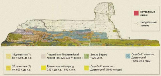 Ko so večkrat posekali sfingo, so odstranili levjo glavo in celoto površina pasme se je zmanjšala na obstoječe velikosti prsi in sprednjih nog, telo pa je dobilo novega človeka glava sloja apnenca tipa III. Kiparji bi morali biti zelo poskusite sorazmerno zmanjšati levjo glavo. Do Žal je ta metamorfoza uravnovešala novo nastalo človeška lobanja sfinge, ki je odtlej postala nova težava.