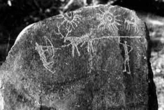 Na prvi pogled se lahko zdi, da je to najpogostejše podoba lova: vidni sta dve osebi z lokom in sulico, zamašeni jelenjad ali los. Zraven lovcev je udomačen pes. Z eno besedo popolnoma trivialni zaplet za rock umetnost naših prednikov. Vendar pa na vrhu kompozicije najdete dve čudni podrobnosti, kot nebesna telesa. Medtem ko ena umetnik je predmet popolnoma opraskal po kamnu, drugi pa samo delno.