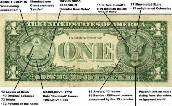 Poleg tega so nacisti in Sovjetski simboli: svastika je prešla iz tajnih društev na bankovce Ruska začasna vlada, izdana do pomladi 1918 let, nato pa uporabljen pri oblikovanju emblema Rdeče armade. In čeprav se ni ukoreninila z nami, je postala znana kot uradnica simbol NSDAP, Po drugi strani pa dobro znani petokraki zvezde, okrašene v zgodnjih dvajsetih, ne samo budenovki in kape Rdeče armade, pa tudi uniforma Hitlerjevih napadalnih letal, na reverjih svojih oblačil nosi pentagram. To je verjetno pojasnjuje dejstvo, da kljub jasnim razlikam v ideologije, vse do nemškega napada na ZSSR pri nas Nemški vojaški specialci so bili usposobljeni, izdelani opremo za potrebe Wehrmachta itd., saj so bili tam vpleteni popolnoma drugače, niso dostopni nepoznanim načela, cilje in cilje. Masonsko se najbolj odraža našel simboliko v ZDA, ki je do začetka 20. stoletja postalo središče globalna koncentracija kapitala. Na hrbtni strani bankovca v en dolar, ki ga je naročil ameriški podpredsednik Henry Wallace ruski emigrantski teozof Sergej Makronovsky (aka – Nikolaja Konstantinoviča Keriča) in dal v promet v poznih 30-ih let, obstaja cel kup masonskih znamenj in simbolov, in še prej skupno moteče ponavljanje števila 13, ki je po nauku Kabala pomeni 13 stopinj posvečenosti. V ozkem smislu trinajst – to je število stopenj razvoja energije in človeške preobrazbe. V širšem smislu trinajst deluje kot simbol nedokončanosti svet in njegovo potrebo po vodenju določene skupine ljudi, “vrhunec”, saj le pod to velesilo pridobi celovitost in se izogne nevarnosti, da številka tudi simbolizira 13. V levem kotu računa nad napisom “Žitni pečat” (“Super pečat “) je postavljena podoba masonske okrnjene piramide, sestavljen iz trinajstih opečnih slojev, kjer je vsaka opeka označuje posamezen narod ali državo s svojim kovancem, simbolizira enotnost vsega denarja na svetu, razporejenega v hierarhiji, ki je opredeljen z vrhom piramide – svetlobnim masonskim trikotnik z očesom Velikega arhitekta vesolja. Ta simbol okronan z latinskim napisom ANNUT COEPTIS, sestavljen iz trinajstih pisma in predstavljajo izkrivljen citat Virgila: “Bodi podpira drzne podvige, “kar je nedvoumno poudarja, da so samo “Izbrani” vnaprej določeni za vladanje svetu. Okrčena piramida je v masonskem smislu simbol svetovni red, ki so ga vzpostavili “svobodni zidarji”, izražanje s tem ideja, da je prostozidarstvo vnaprej določeno z vlogo vladajočih klan. To še enkrat najde potrditev v napisu na Latinsko: NOVUS ORDO SECLORUM, ki se nahaja med podstavek piramide in napis na “Velikem pečatu”. Njen prevod govori o določenem “novem redu za stoletja”. Na desni strani računa prikazuje orla, ki nosi ščit s trinajstimi črtami (svetloba in temno). Še več, presenetljivo je, da v svoji desni šapi drži akacijeva veja s trinajstimi listi in trinajstimi brsti cvetoče rože. A akacija, kot veste, ni samo sveto drevo prostozidarstva, ki vam omogoča, da odprete grob Hirama, hkrati pa simbolizira moč masonske tradicije in organizacije, posedovanje skrivnega znanja, sposobnost vstajenja oz nesmrtnost. V levi šapi orel drži kup 13 puščic oz. simbolizira znanje in moč, zasnovano za pomiritev in kdaj potrebujejo in uničujejo sovražnike, v idealnem primeru vsakega od trinajst puščic ogroža enega od trinajstih stopenj piramida zasužnjenega človeštva. Širše, puščice pooseblja uspeh, ki bi moral spremljati napredek v smeri najvišji svetovni cilj “Nov red za stoletja.” V kljunu drži orel trak s tradicionalnim masonskim sloganom spet 13 črk: “E PLURIBUS UNUM “(” od mnogih – eden “), Po mnenju masona nauk, ki temelji na starodavnih materialističnih naukih o izvor sveta, začetek pa je bil le “Eno”, ki je kasneje razpadla in še naprej razpada na številne različna bitja, predmeti, pojavi, vrste, kategorije itd. Zato je idealen cilj uničiti Mnogo, odpraviti bogastvo raznolikosti, ki je lastna ljudem, njihovim tradicijam in kulturam, zaradi obnove posodobljenega.
