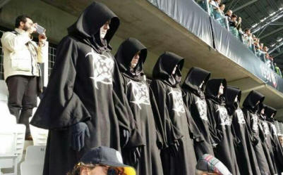 Enajst »ljudi v črnem« s skrivnostnim znakom na oblačilih nastopil na nogometni tekmi v Nemčiji, poroča goal.com.