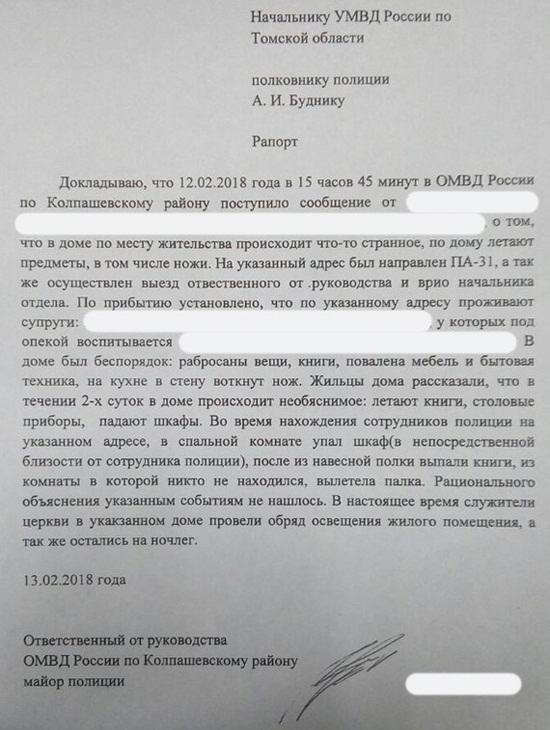 Oče Aleksej, ki je prišel, da bi opravil tako pomembno cerkev Treba, je novinarjem povedal, da je na lastne oči videl, kako s stola kuhano jajce je vzletelo in trkalo na glavo Igorja, najmlajšega otroci družine. Kmalu je tja prišla policijska komisija iz Tomska. Ali višji redovi niso verjeli majorju Artamonovu, ali nasprotno, odločili so se takoj prevzeti nadzor nad situacijo, tako da nihče ne bo trpel zaradi poltergeističnih dejanj. Toliko zaposlenih v uniformi, ja tudi s tako visokimi uvrstitvami jih v Maraxu še nikoli niso videli. Družina posesti hišo in že dovolj trpeti od akcije nevidni duh, trenutno živi pri sorodnikih in dokler se ne mudi, da bi se vrnil k sebi.