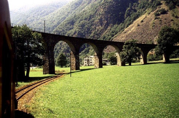 Na stvaritve človeških rok, kot je ta spiralna viadukt, ki je bil zgrajen v Švici v bližini mesta Brusio, lahko pazi na uro. Še posebej je privlačna v času, ko vlak se spusti ali dvigne do njega.
