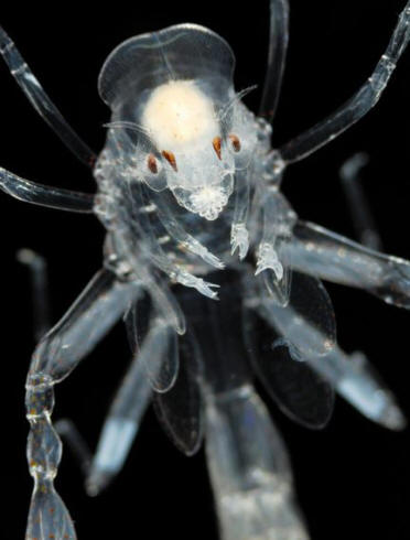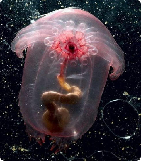Фотоiz odprtih virov Fronima – parazit, ki potuje in raste potomstvo v deblu drugega bitja. Običajno so izberite salp, opisan zgoraj, in s pomočjo impresivne sprednje strani kremplji, sprednje stranice so izrezale notranjost in pustile prazno struktura v obliki sode. Nato se povzpnejo v notranjost salp in potujte po morjih in oceanih ob poti in sprejemajte hrano in vodo. Cyanogaster noctivaga