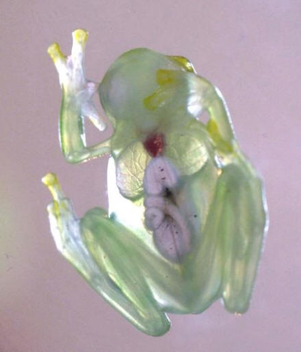 Фотоiz odprtih virov Te žabe se po videzu ne razlikujejo od drugi (zeleni in z velikimi očmi), dokler je ne pogledate trebuh. Skozi njo lahko lepo vidite notranje organe žabe – jetra, srce, prebavila in včasih celo jajca pri samicah. Бабочка Грета Ото