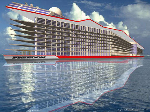 Med obvladovanjem zemlje je človek hkrati obvladal vodna prostranstva. Ladje je postajalo vedno več, morska potovanja – vse dlje. Do 21. stoletja je doseglo udobje na potniških linijah prej nepredstavljive višine. Nekdaj smrtonosni marinec Potovanje se je spremenilo v prijetno zabavo. Samo levo samo en korak, da postane ladja prevozno sredstvo stalno prebivališče. In kot kaže, je bil ta korak že storjen. Kmalu naprej na oceanu se bo pojavila ogromna ladja bo živel. Ideja pripada Normanu Nixonu, lastniku podjetja. “Inženirske rešitve”. Prvotno je bila ladja načrtovana kot velikanska križarka, vendar že v fazi razvoja projekta Nixon je dobil idejo, da bi spremenil koncept in se obrnil ladja v plavajočem mestu. Ambiciozen projekt, imenovan “Ladja svobode” (ladja svobode). Za izvedbo načrta je bilo Ustanovljen je bil Freedom Ship International. Dimenzije ladje so neverjetne. Dolžina – več kot kilometer (1307 m), širina – 300 metrov, skupna teža – 3 milijone ton, pretok – 2,7 milijona ton. 25 krov na katerem bo vse za življenje, delo in sprostitev: restavracije in bari, računalniške sobe in igralnice, stadioni in bazeni, sodišča in kinodvorane. V mestu bo hkrati živelo 100.000 ljudi, od tega 80.000 potnikov in 20.000 vzdrževalnega osebja.