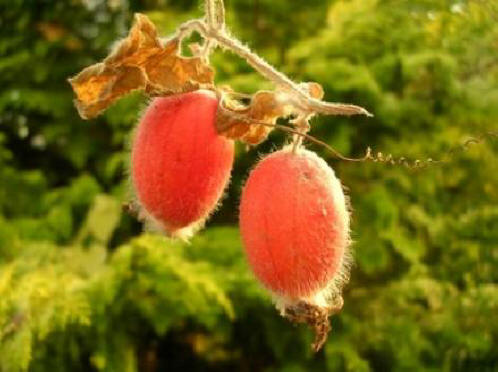 Fotografije iz odprtih virov Slika te radovednosti poznano vsem – zahvaljujoč stiliziranim odtisom na tekstilu, v tiskarne itd. Imenujejo se tudi vzhodni plazec družine buč nora melona ali balzamična hruška. Podolgovata jagodičja svetlo oranžna, prekrita z mozolji, vsebuje rdeča semena, ki imajo okus zrele persimmons. Sama ovoj blizu okusa zorjene buče z grenkobo.