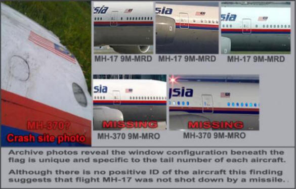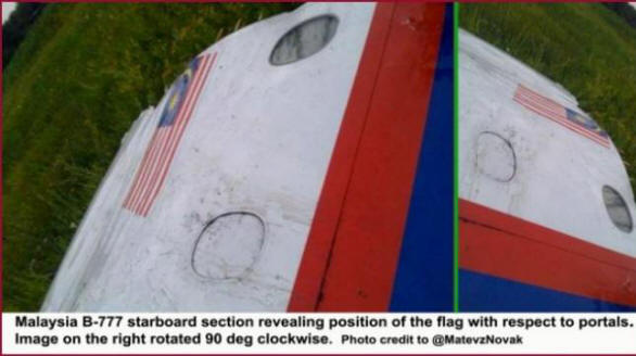 Pozorno poglejte položaj zastave na razbitinah zrakoplova Ukrajina. Vidite zadnji rob zastave (stran z rdečo in bele črte), ki se nahajajo neposredno nad okensko odprtino, prekrita s kovinsko ploščo. Ni okna. Zdaj previdno poglejte drugo fotografijo, na kateri sta zajeta tako MH-17 kot MH-370. Na fotografijah MH-17 se jasno vidi, da je zadnji rob zastave obložena z oknom! Toda na fotografijah MH-370 vidite, da je hrbet rob zastave je neposredno nad kovinsko ploščo, zapiranje luknje za okno! Fotografije ne lažejo! Torej je to fragment letala MH-370!