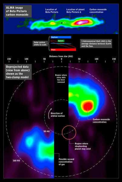 Oblak ogljikovega monoksida (v zgornjem desnem kotu) v sistemu Beta Slikar skozi oči radijskega teleskopa ALMA. Teoretično ni zaznano medtem ko lahko planet (približno 50 AU od zvezde) proizvede podobno oblak na nasprotnem delu poti okoli svetilnice, vendar drugega oblaka še ni bilo mogoče najti. Dejstvo, da je oblak ki se nahaja na precej nenavadnem mestu – 13 milijard km od nje zvezde trikrat dlje kot od Neptuna do Sonca. Da grem sem tako intenzivna trka je potreben vpliv bližnjega planeta. Astronomi govorijo le o dveh verjetnih scenarijih takšnih dogodkov: bodisi velik planet, ki tehta Saturn, privlači na to območje oblaki kometov, ki v njihovi bližini pripravijo tekoči trak uničenje kometov ali pa vidimo rezultat ne dolgotrajnega procesa, in en sam trk para protoplanetov od ledene planetesimals, ki po velikosti ustrezajo Marsu. Kateri od teh hipoteze niso bile resnične, znanstveniki so bili deležni zelo resnih upanj odkritje drugega planeta s strani Bete slikarja. In celo nekaj. Poročilo študije je objavljeno v Science Express. Pripravljeno na podlagi materialov z univerze v Cambridgeu.
