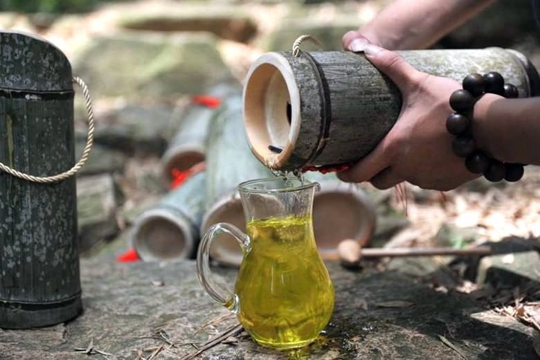 Postopek “pridobivanja” že pripravljenega likerja je zanimiv. Stranke pogosto vabljeni, da vidimo, kako drugače odseki bambusovih debla, ki določajo, kje je dragocena mešanica, nato izvrtajte majhno luknjo, da se lahko razlije v stekleno posodo. Liker je pripravljen piti lokalno, če pa nekdo ga želi dobiti, da bi naredil impresivno darilo, on lahko izberete bambusovo koleno v obliki neke vrste lesene steklenice (glej spodnji video).