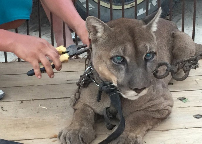 Ko je ugotovila mednarodna organizacija za zaščito živali Mustafa, ležala je zvita na dnu kombija. Cougar bila tako izčrpana in ustrahovana, da je sploh ni prikazala agresija do ljudi, ki so iz nje odstranili težko, zarjavelo verigo. Zaposleni organizacije priznavajo, da nič bolj žalostnega kot prizor tega vogalega, na pol mrtvega bitja še niso so videli.