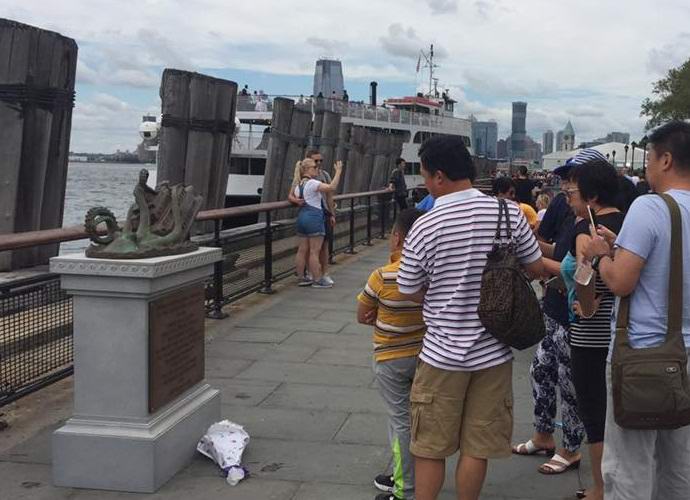 Ta bronasti spomenik je tehtal sto štirinajst kilogramov je bil pred kratkim nameščen v Battery Parku na Manhattnu. Skulptura poklicana v počastitev spomina ljudi, ki so jih leta 1963 domnevno utopili krivda je ogromna hobotnica, trajekt Otok Staten