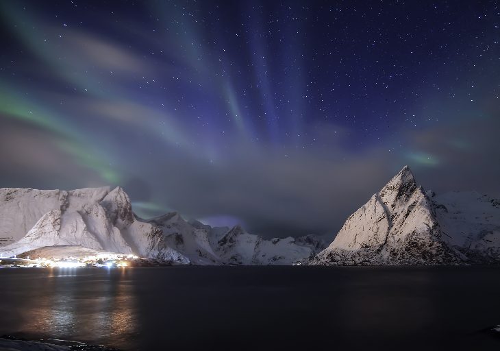 Aurora borealis z modrim sijajem je napolnila nebo zgoraj norveške otoke Lofoten prej na nenavaden način zeleni sij, ki se je oblikoval, je osvetljeval nočno nebo.