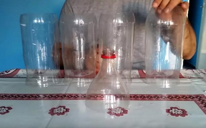 Torej iz štirih steklenic odrežemo dno in vrat, tako da do vratu so bili upogibi najmanj 2 centimetra. Toda peta uporabljajte samo vrat z upogibom in majhen raven del steklenice (spet približno 2 centimetra).