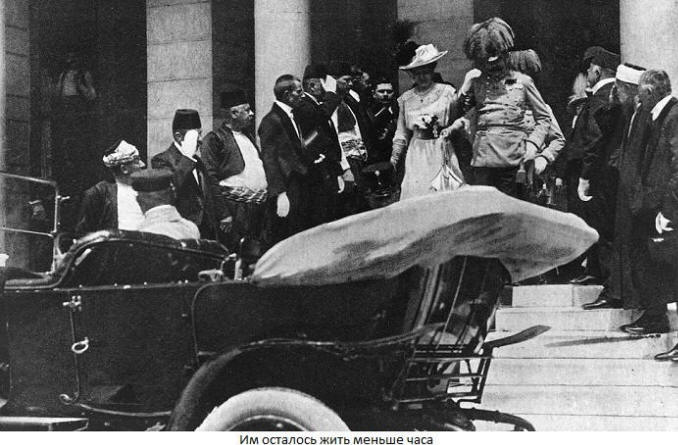 Granata se je odbila od vrha in eksplodirala pod kolesi naslednjega avtomobili. 20 ljudi je bilo poškodovanih, nadvojvoda pa ne. Po slovesnosti v Mestna hiša Franz Ferdinand in njegova žena sta šla v bolnišnico na obisk prizadet med poskusom atentata. Spet smo se odpeljali po promenadi, kam motocikel je čakal Gavrila Principa. Dva posnetka – dva trupla: Nadvojvoda in njegova žena.