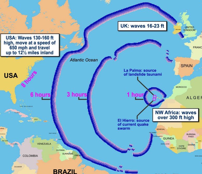 Katoliški mistik in teoretik zarote Emmett O’Regan (Emmett O’Regan) opozoril, da med 23. septembrom in 13. oktobrom letos se bo zgodilo megatsunami (mimogrede, rok je že minil), ki bo visok vsaj 650 metrov, in to velikan val bo zajel ZDA. Povzročil jo bo potres na Kanarskih otokih kar ima za posledico izbruh vulkana Cumbre Vieja, ki na koncu se zrušijo v ocean, kar povzroči neprimerljivo njegovo dogajanje moč cunamija.
