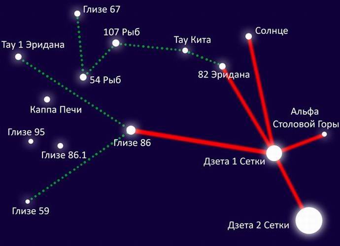 Ameriška navdušenka astronoma Margery Fish, ki živi v Ohiu, Dolgo sem preučeval zemljevid Hilla, poskušal najti nebesnih teles, katerih položaj bi ustrezal risbi. Margery je iskal zvezde petdeset svetlobnih let od Sonca, pa tudi tiste svetilke, v bližini katerih bi lahko biti primeren za organsko življenje planeta. Izračuni astronom je nenadoma dal pozitiven rezultat – izkazalo se je, da vesoljci, ki so ugrabili Barneyja in Betty, bi lahko s Zemljo leteli na Zemljo planet, ki se nahaja v bližini binarnega sistema zvezd Zeta-1 in Zeta-2 v ozvezdju Grid. Obstoj teh planetov v 82 Eridanus in 54 Ribi je znanstveno dokazano dejstvo. Torej zemljevid, sestavil Betty Hill, prikazuje zelo specifično mesto Vesolje.
