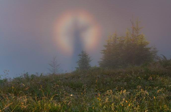 Človeška senca prehaja skozi meglo, kotura in bizarni obrisi, ki jih povzroča perspektiva. Med človekom in oblaki so lahko več kilometrov, zato je senca ogromna dimenzije in njeni deleži se pogosto spreminjajo, na primer podaljšajo roke ali noge. Kapljice vode, raztresene po zraku, senca lahko prevzame tridimenzionalni videz in navdihuje opazovalce s pravim mistični strah.