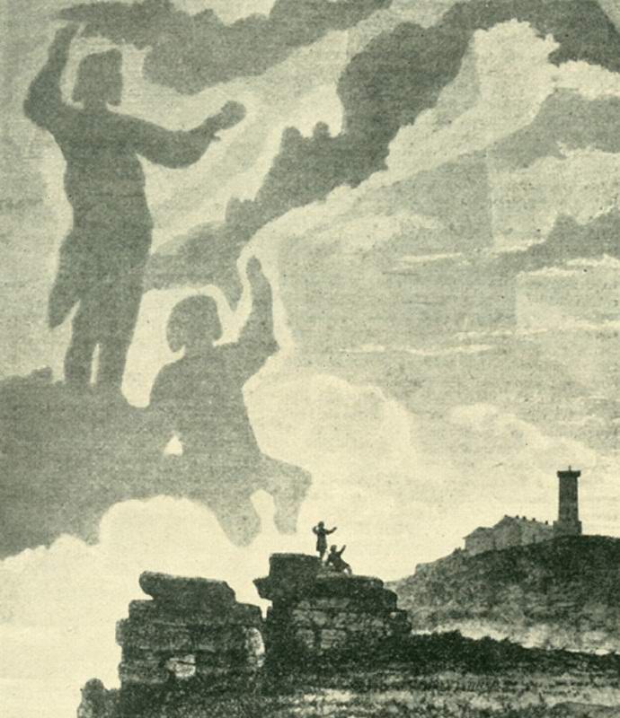 Na primer, obstaja srednjeveška nemška legenda o pastirju, ki so v begu pred roparji hiteli na goro. Ujeto naprej prihranil greben kamenja, ustavil se je, da bi se spočil in opazil pod oblaki, zaradi katerih se je tresel od strahu. Čez pobočje, ki se je spuščalo, je stalo, ne da bi se dotaknilo tal, ogromno temno človek, nekoliko zasenčen z meglo. Stopala so se mu zalila vijugavi oblaki.