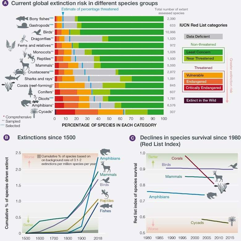 Strokovnjaki ocenjujejo, da je približno 75% kopnega, 40% svetovnih oceanov in 50% rek in jezer je že nekoliko propadlo po krivdi naše civilizacije. Ogroženih je več 40% dvoživk, približno 33% grebenih koral in več kot 35% morskih sesalci Vendar natančnih podatkov o žuželkah še ni nekateri strokovnjaki predlagajo, da izumrtje grozi vsaj 10% na primer popolno izginotje ogroža čebele, brez katerih svet okoli nas ne bo postal samo revnejši, a tudi manj velikodušen do nas glede hrane.